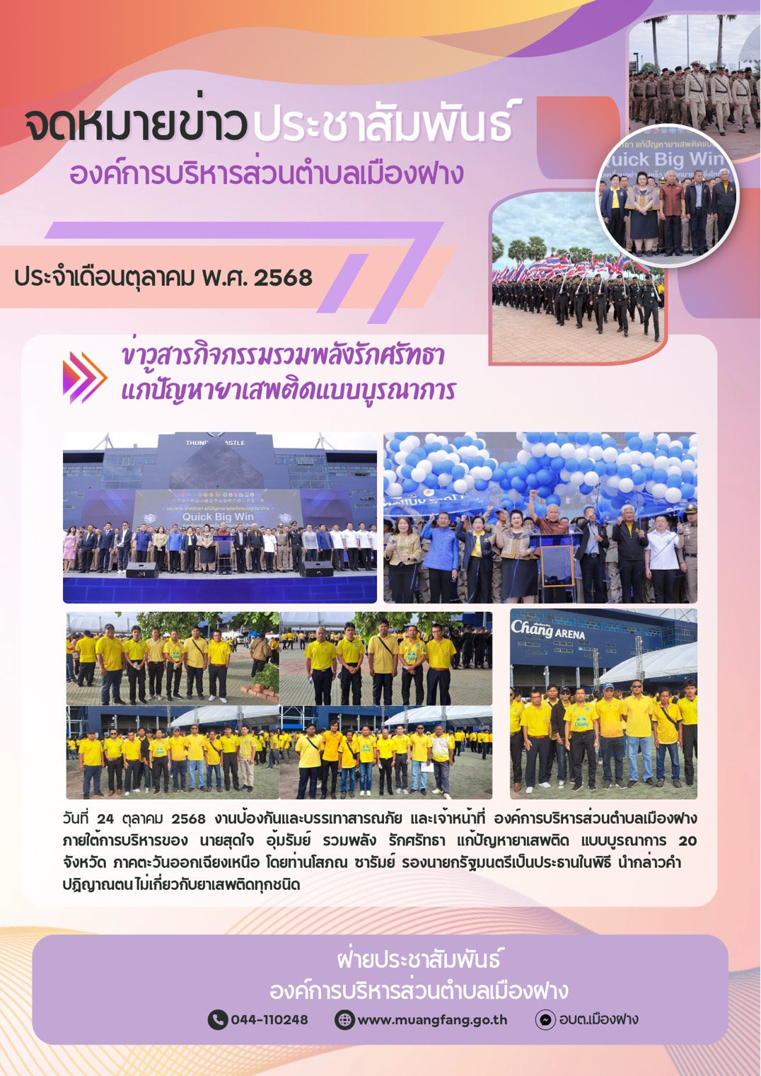 วันที่ 29 กันยายน 2568 องค์การบริหารส่วนตำบลเมืองฝาง จัดกิจกรรม"วันพระราชทานธงชาติไทย " (Thai National Flag Day) ประจำปี 2568 เพื่อเป็นการสร้างความภูมิใจของคนในชาติ และน้อมรำลึกในพระมหากรุณาธิค
