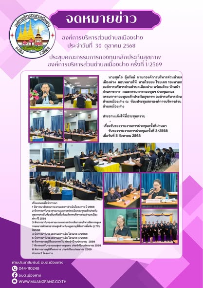 วันที่ 30 ตุลาคม 2568 ประชุมคณะกรรมการกองทุนหลักประกันสุขภาพ องค์ารบริหารส่วนตำบลเมืองฝาง ณ ห้องประชุมสภาองค์การบริหารส่วนตำบลเมืองฝาง